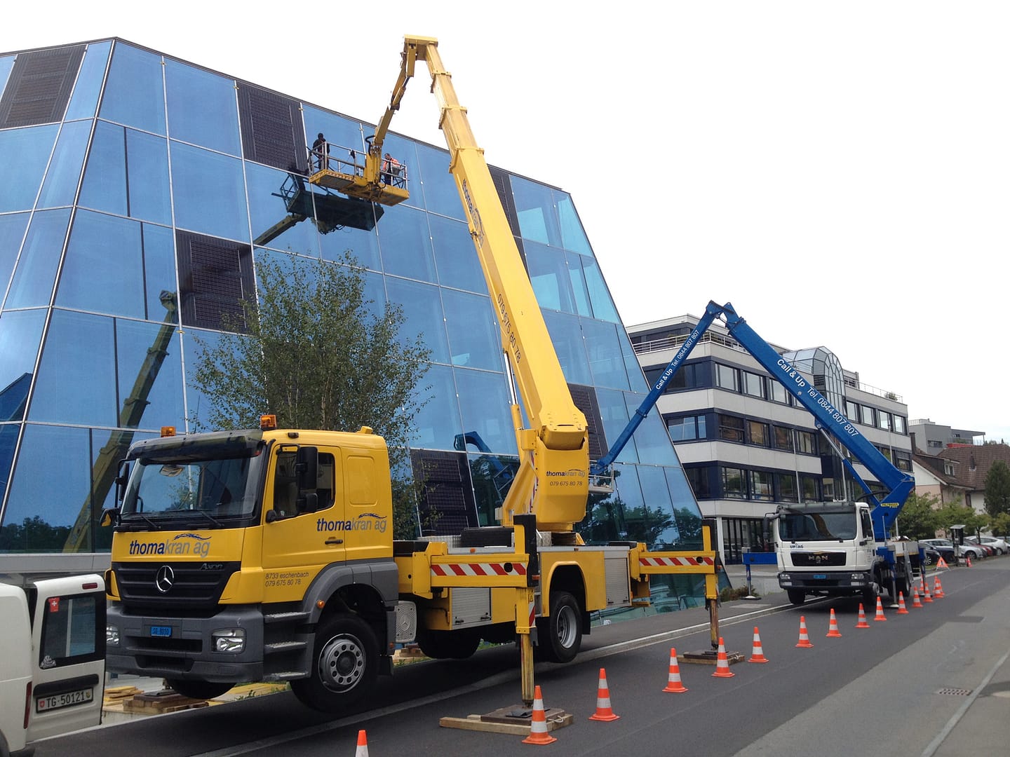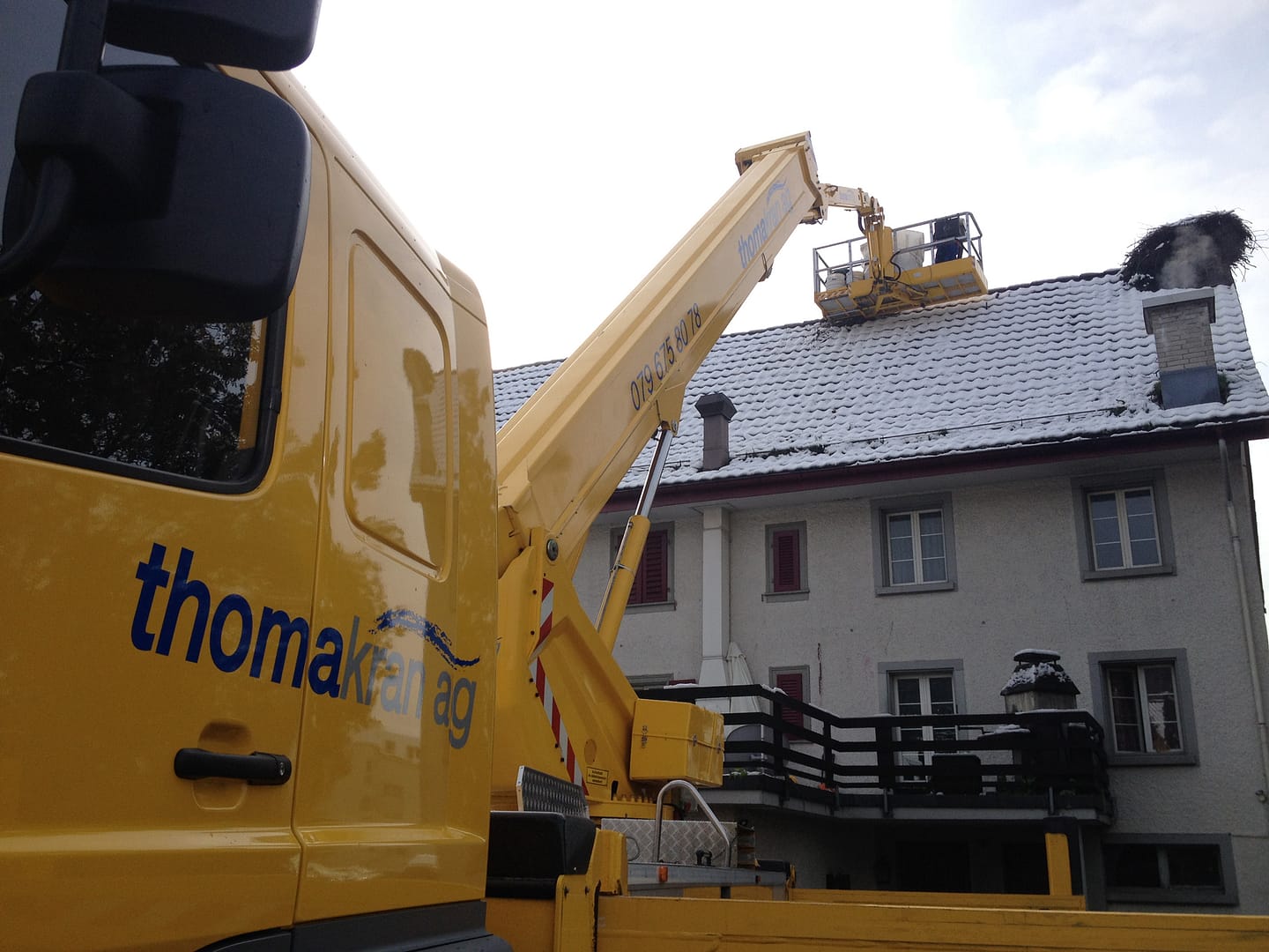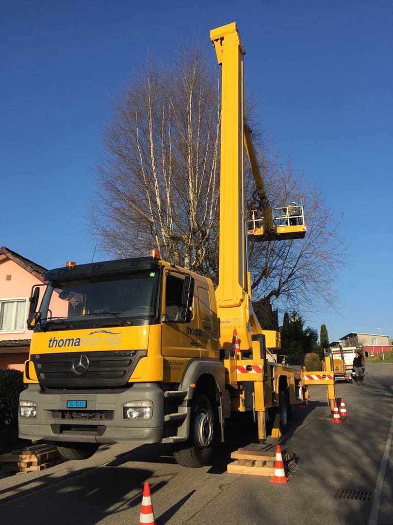 Mit unserer LKW-Arbeitsbühne, auch Hebebühne genannt, sind Arbeiten in bis zu 47 Meter Höhe möglich. Das Arbeiten mit der Arbeitsbühne erfordert je nach Art und Standort eine gute Planung. Gerne koordinieren wir für Sie die Arbeiten, holen Bewilligungen für Strassensperrungen ein und organisieren Lichtsignalanlagen, damit Sie auch in luftiger Höhe sicher arbeiten können.