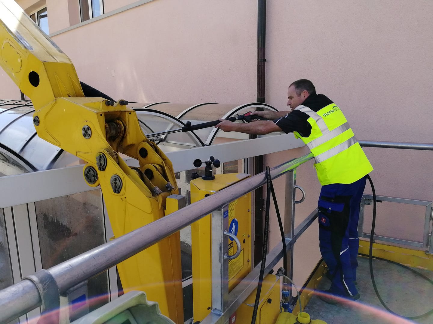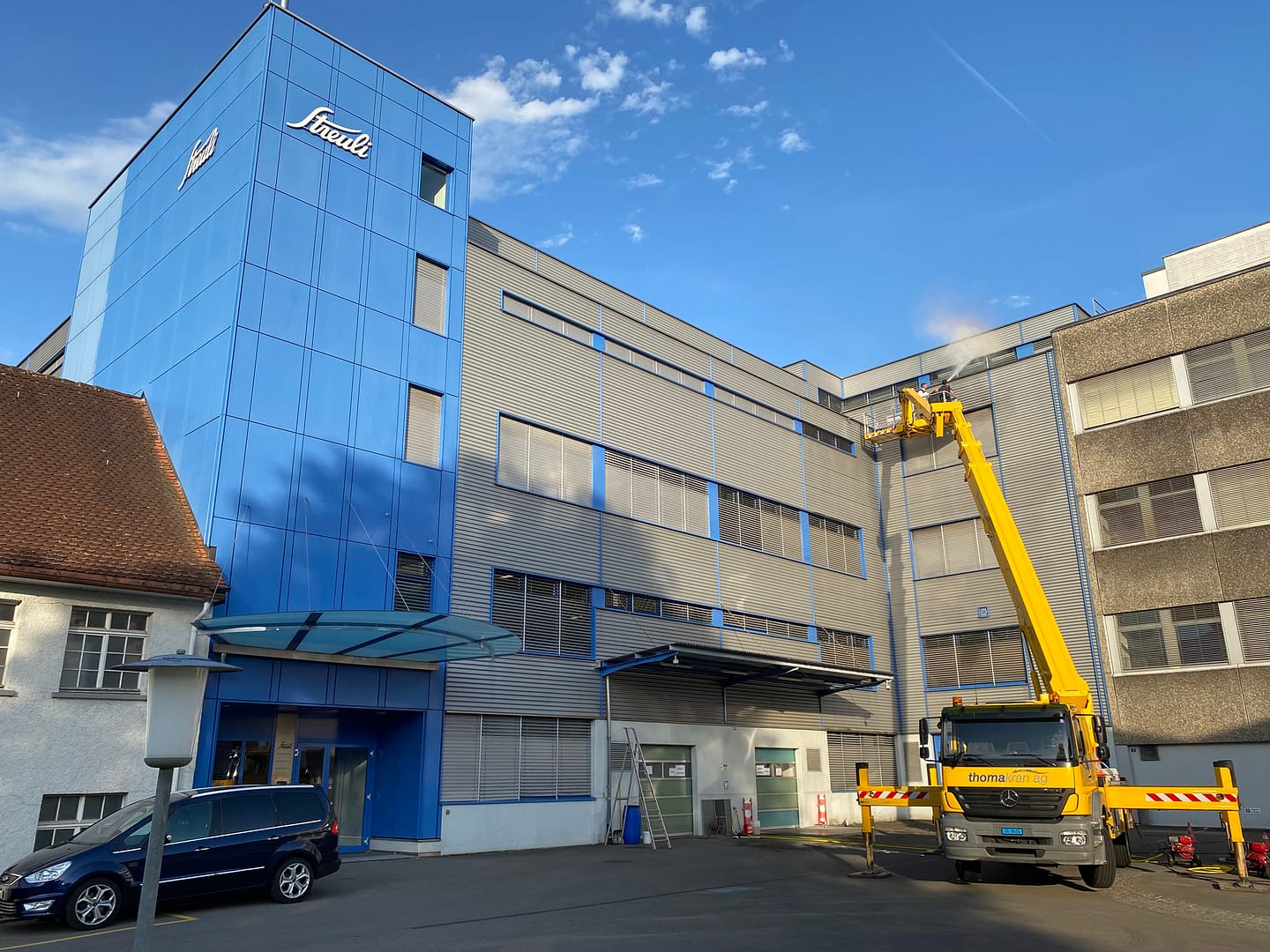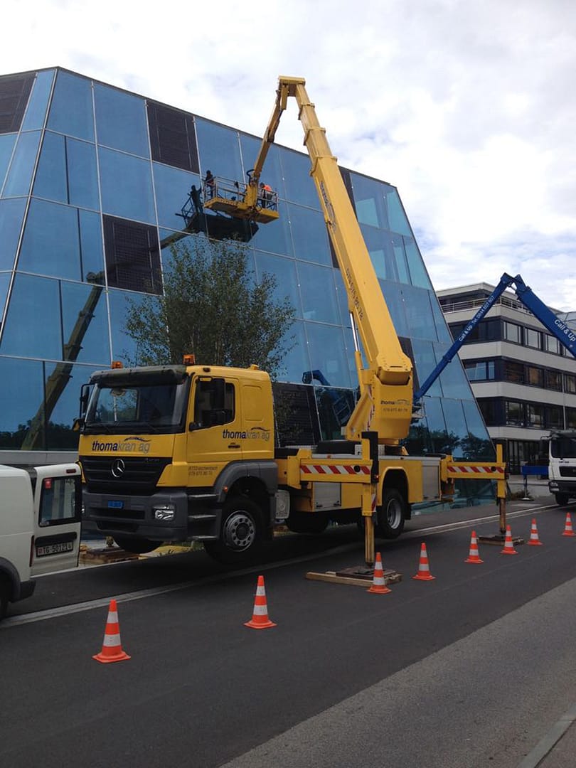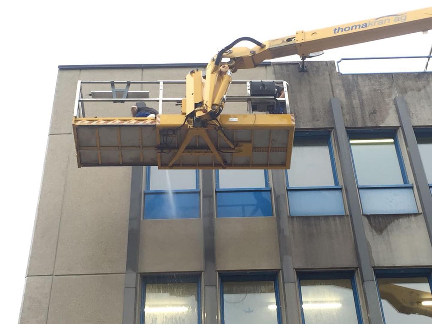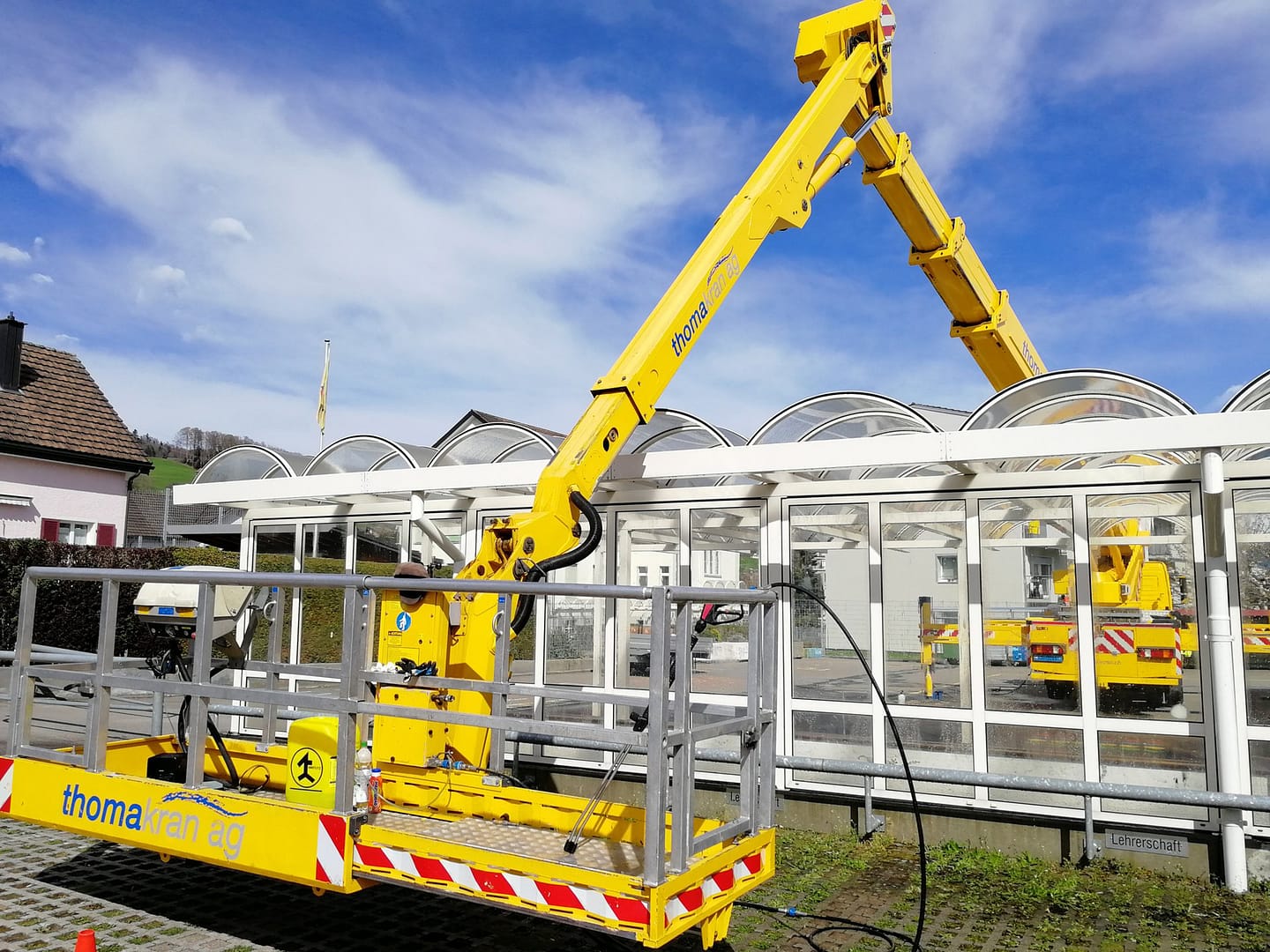 Von der Arbeitsbühne aus können Gebäude, Fassaden, Dächer und Photovoltaikanlagen sicher und SUVA-konform gereinigt werden. Sie können die Reinigung direkt mit dem auf der Arbeitsbühne eingebauten Hochdruckreiniger (250 bar) vornehmen oder unsere Spezialisten übernehmen  das Reinigen für Sie - schnell, zuverlässig und sauber. Gerne stehen wir Ihnen für eine persönliche Beratung zur Verfügung.